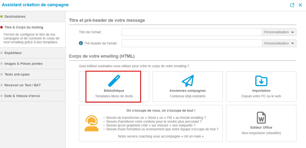 Dans l’onglet « Titre & Corps du mailing », cliquez sur le bouton « Bibliothèque ».