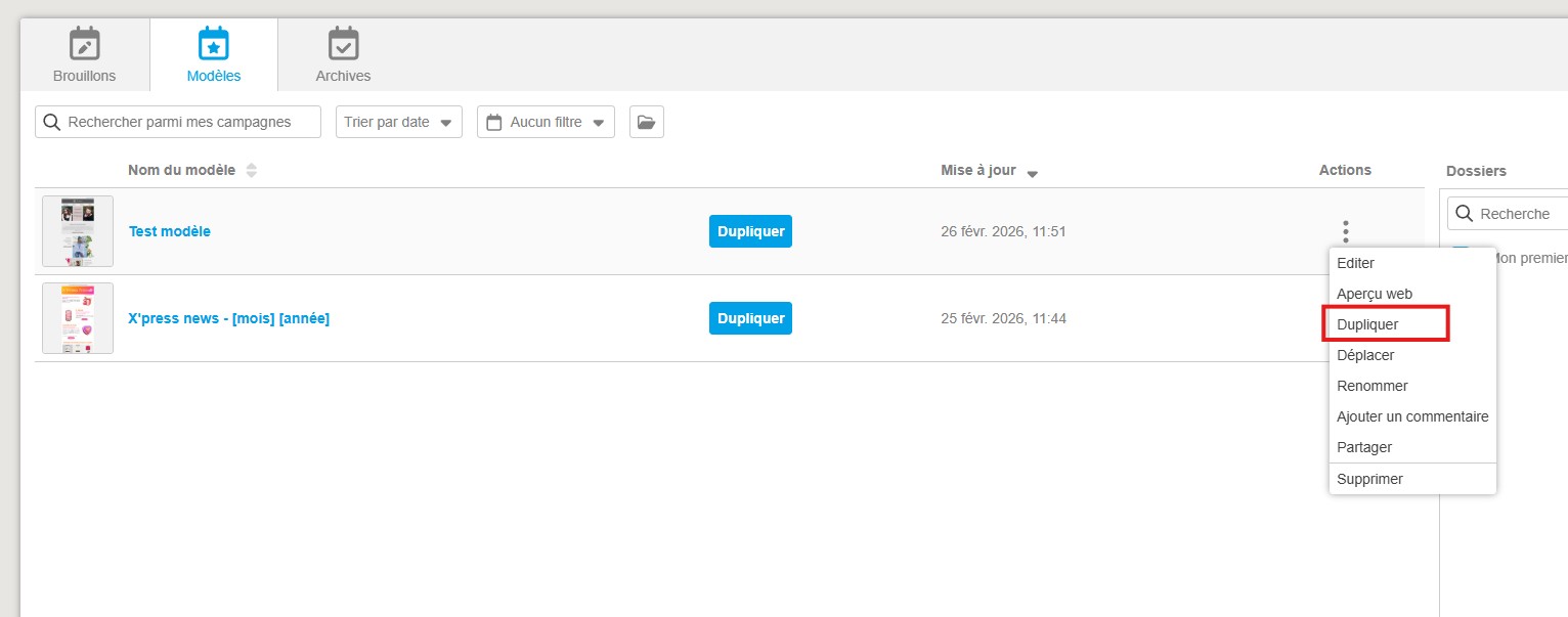 Note : Pour supprimer un modèle, répétez la procédure et cliquez sur « Supprimer » au lieu de « Dupliquer ».