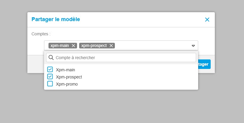 - Choisissez les comptes (principal et/ou sous-comptes) avec lesquels partager le modèle.